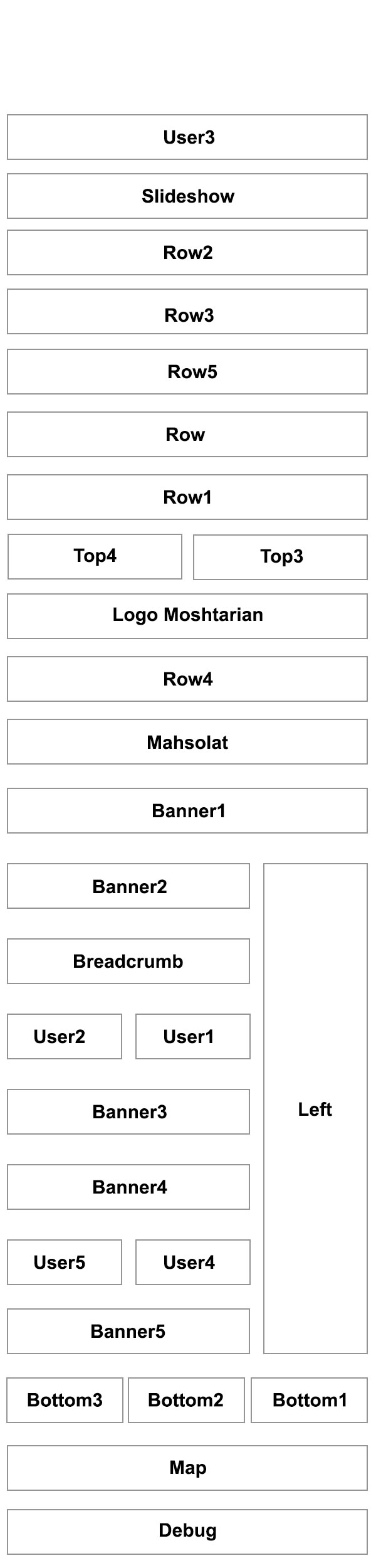 این قالب دارای 28 موقعیت به ترتیب زیر است و همچنین 20 موقعیت مخفی نیز برای Tab در افزونه GK5 تعبیه شده است.